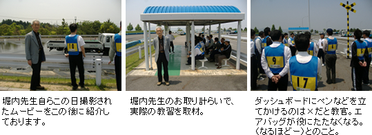 事故撲滅推進室より発刊予定のエコ安全ドライブにまつわる季刊誌「エコ経営」に堀内先生やクレフィール湖東さんにもご協力を快諾頂きました。次回こちらをお尋ねする際は、教官の方々の現場ノウハウを事故抑止のツール開発に結び付けたいと考えております。 |