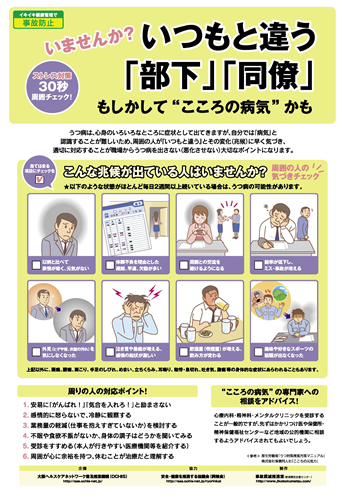 | 内容: | ストレスからうつ病に発展してしまうこともあります。 兆候が出ている人が同じ職場にいないでしょうか? 本ポスターでは周りの人の気づきチェックと対応ポイントなどを解説。 |
